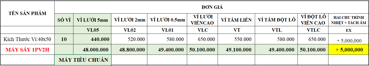 - Sức chứa: 10 khay 400mm x 500mm: Tổng diện tích sấy :2m2