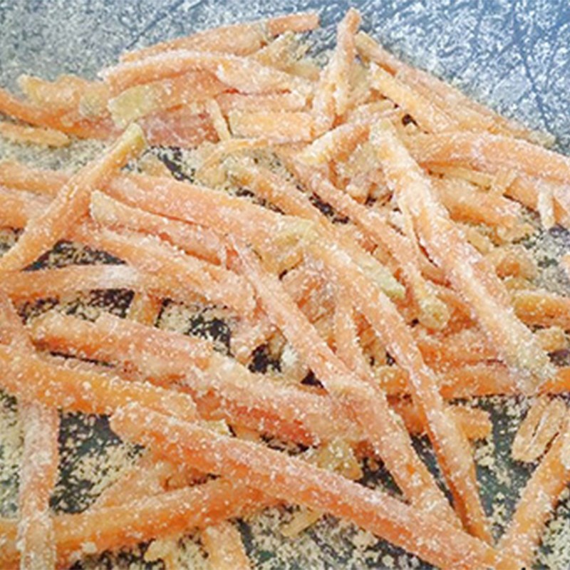 Bước 5: Cho phần đường còn lại vào hòa tan với khoảng 70ml nước lạnh, đổ vào chảo đun sôi. Khi nước đã sôi, bạn tiếp tục cho bí đỏ, vỏ cam vào đảo đến khi nước đường cạn, kết tinh lại, tạo thành một lớp áo đường màu trắng bám bên ngoài sợi mứt là được.