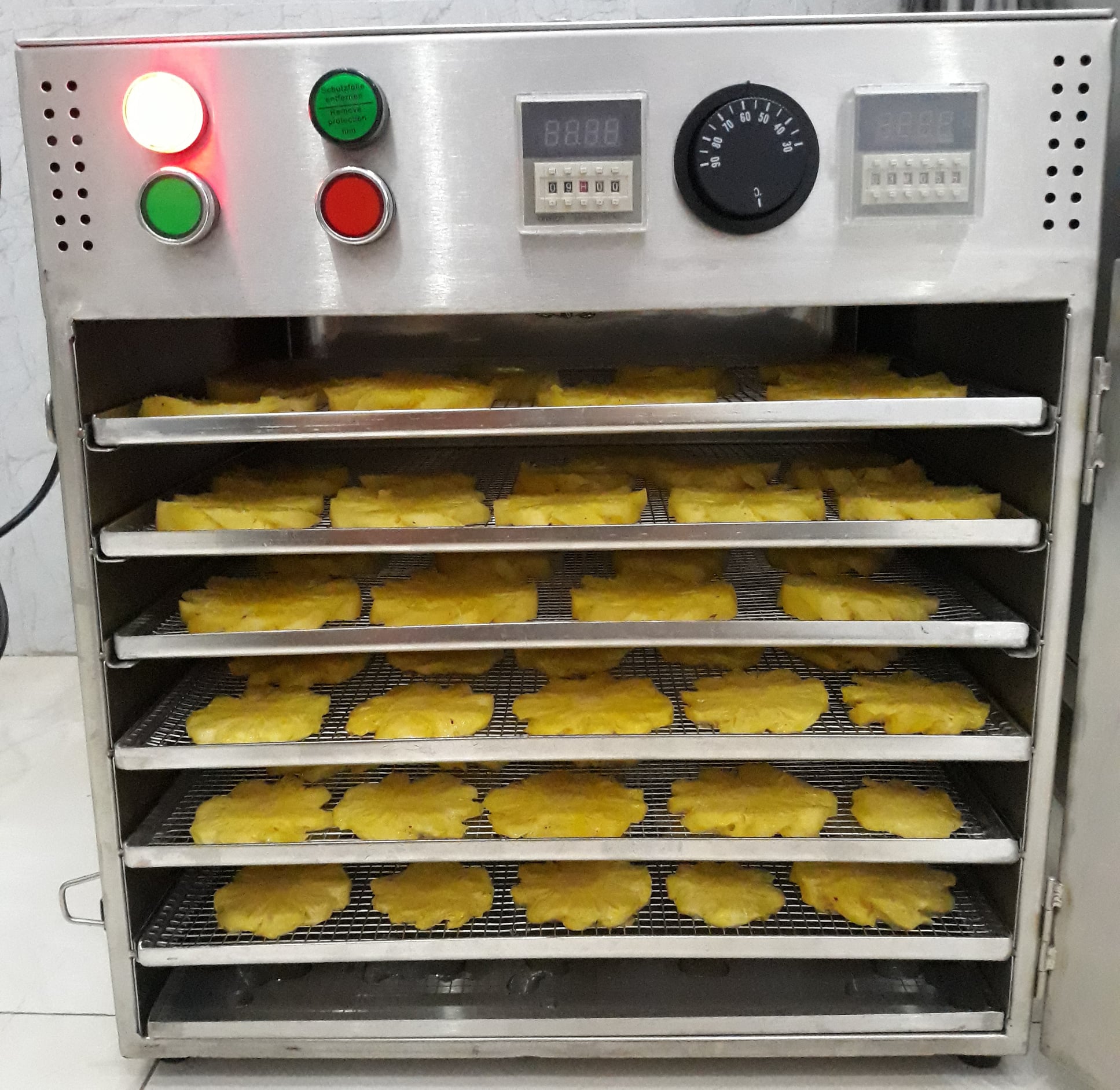Bước 3: Cho thơm đã cắt lát vào từng khay sấy inox, tiến hành điều chỉnh các thông số nhiệt độ, thời gian, tách ẩm phù hợp,... Theo đó, thời gian hoàn thành mẻ sấy 5 - 7 giờ đồng hồ. Lưu ý, với thơm dẻo, dòng khay sấy thích hợp là loại khay dạng lỗ hoặc dạng lưới.