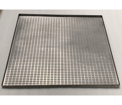 Khay sấy vỉ tấm đột lỗ VLT: Đây là dòng sản phẩm khay sấy chuyên dụng chịu lực, lỗ oval 8x16mm, viền 20mm. Sản phẩm chuyên được sử dụng để sấy các sản phẩm kích thước lớn, nặng. Lưu ý: Khay sẽ kém hiệu quả khi sấy các sản phẩm 2 mặt do độ che phủ mặt dưới lớn.