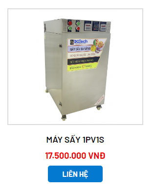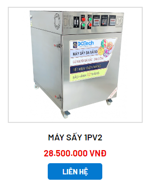 Máy sấy 1PV1: Đây là dòng máy sấy đa năng mini, thích hợp cho quy mô gia đình, hộ sản xuất nhỏ. Máy sấy 1PV1 có kích thước ngang 420mm x cao 450mm x sâu 600mm, với sức chứa 6 khay 300 x 400mm, cho phép sấy 2 - 15kg/ mẻ sấy. Máy sấy 1PV1 được gia công từ inox 304 chuẩn 2 lớp, thích hợp cho sấy đa dạng các loại thực phẩm với thời gian sấy trung bình 2 - 6 giờ đồng hồ. Sản phẩm được bảo hành 18 tháng, hỗ trợ giao hàng toàn quốc.