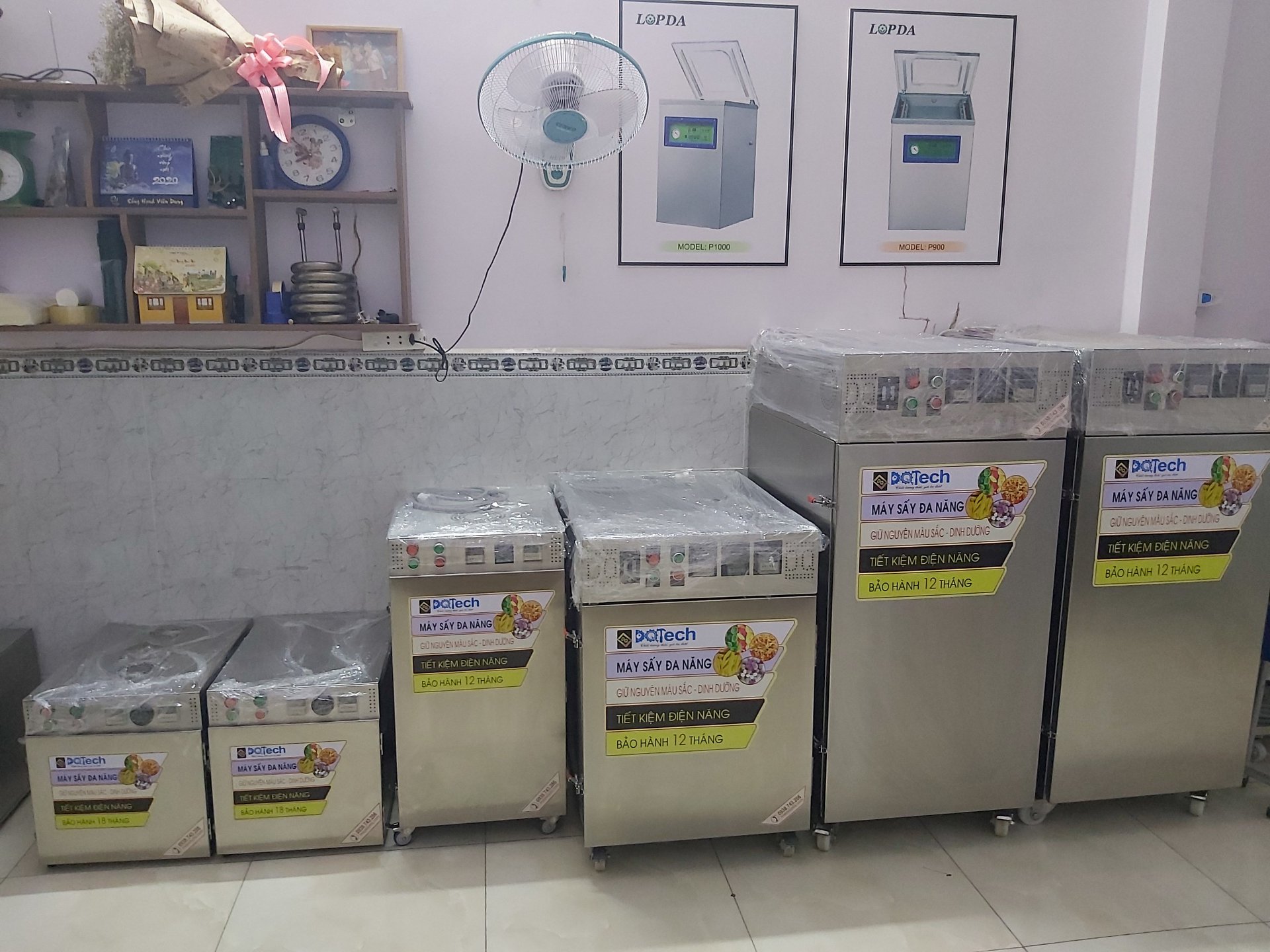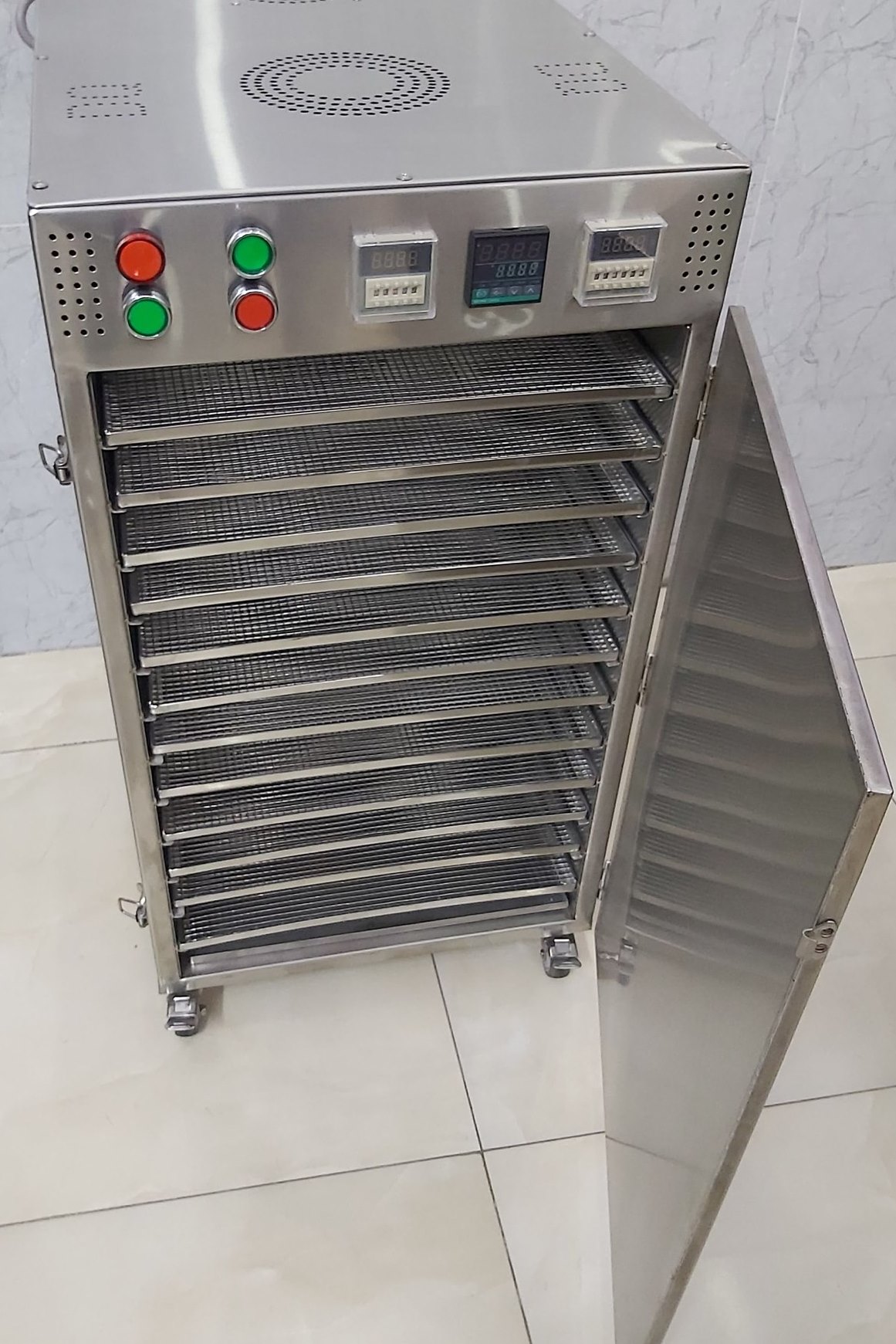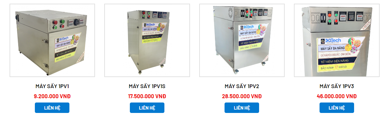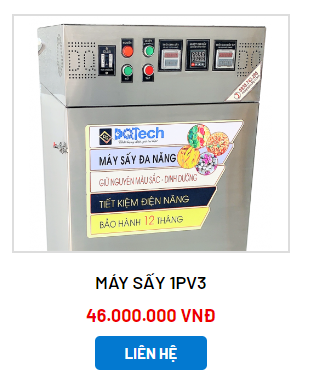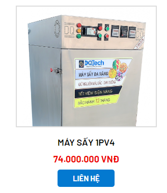 Máy sấy 1PV3: Đây là dòng máy sấy đa năng hộ sản xuất được ứng dụng phổ biến bậc nhất hiện nay. Sản phẩm được gia công từ inox 304 chuẩn 3 lớp với kích thước ngang 580mm x cao 1310mm x sâu 800mm. Máy sấy 1PV3 có sức chứa lên đến 17 khay 400 x 500mm, với tổng diện tích sấy là 3,4m2. Sản phẩm máy sấy 1PV3 cho phép sấy từ 10 - 80kg/ mẻ sấy. Sản phẩm được bảo hành 12 tháng theo quy định từ DQTech.