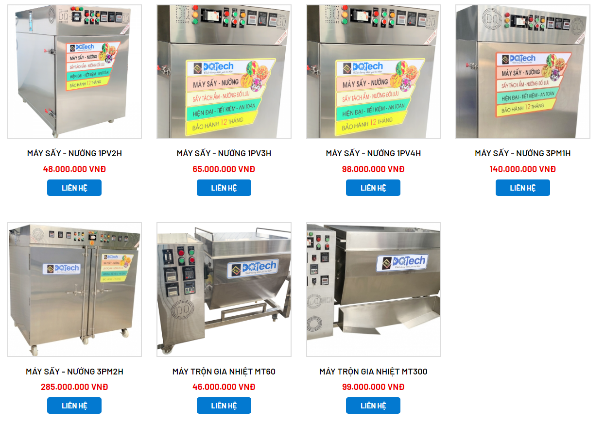 Bên cạnh máy sấy gió nóng, DQTech còn sản xuất và phân phối các dòng máy sấy lạnh, máy sấy nhiệt, các loại máy phục vụ sản xuất khác như máy hấp, máy ép lạnh, nồi nấu, máy rửa rau củ,... Các dòng máy đều được bảo hành theo quy định, 18 tháng đối với dòng tủ sấy thực phẩm mini 1PV1, 12 tháng đối với các dòng máy còn lại. Chúng tôi bảo hành điện tử theo mã đơn hoặc số điện thoại của khách hàng.
